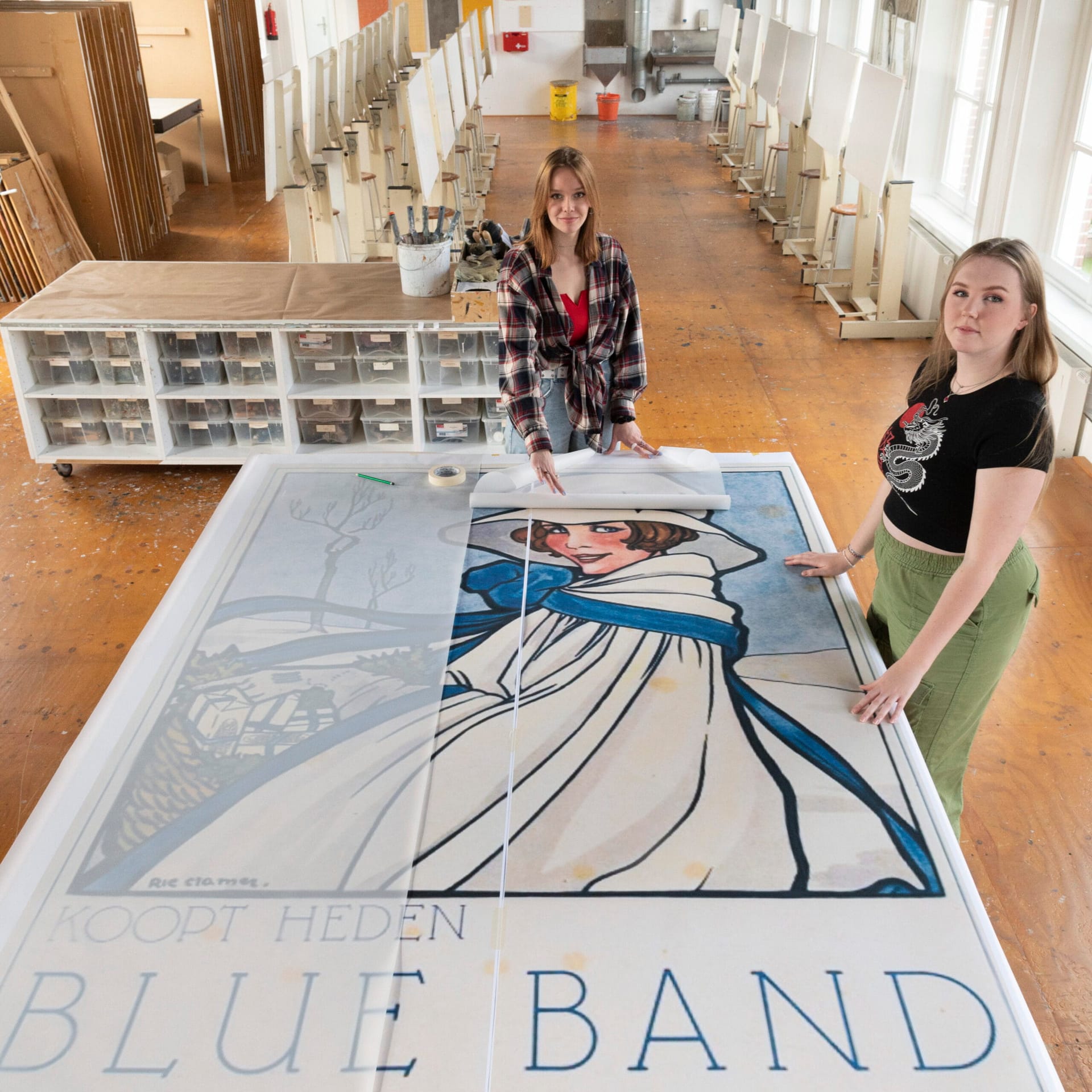Student Lonneke vertelt enthousiast: “Blue Band is een heel bijzonder en leerzaam project voor mij geweest. Met de ervaring die ik heb opgedaan op school kon ik met veel dingen helpen en ook weer nieuwe ervaringen opdoen. Om iets in de praktijk te doen, wat je normaal in het klaslokaal doet is natuurlijk superleuk. Het hele proces heb ik meegemaakt, van onderzoek tot schilderwerk. Ik vind het bijzonder om als derdejaars student met zo’n project mee te werken en samen met een getalenteerde kunstenares dit kunstwerk op de muur te zetten. Een stukje van mijn kunst zal nu altijd op de muur staan en dat maakt het zo’n bijzondere stage. Stichting Teekens aan de Wand is een mooie organisatie en ik ben blij dat ik een bijdrage heb kunnen leveren om opnieuw historische kunst te laten zien. Ik hoop dat ik dit jaar een nog meer projecten mag meewerken bij deze stichting.”