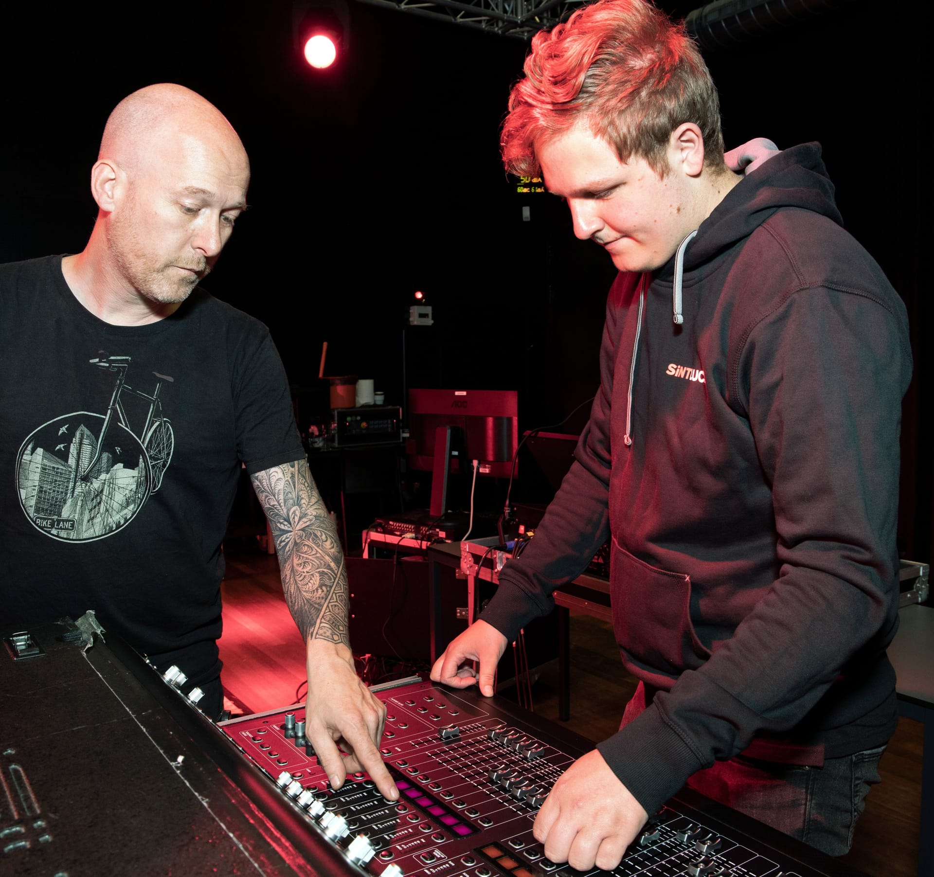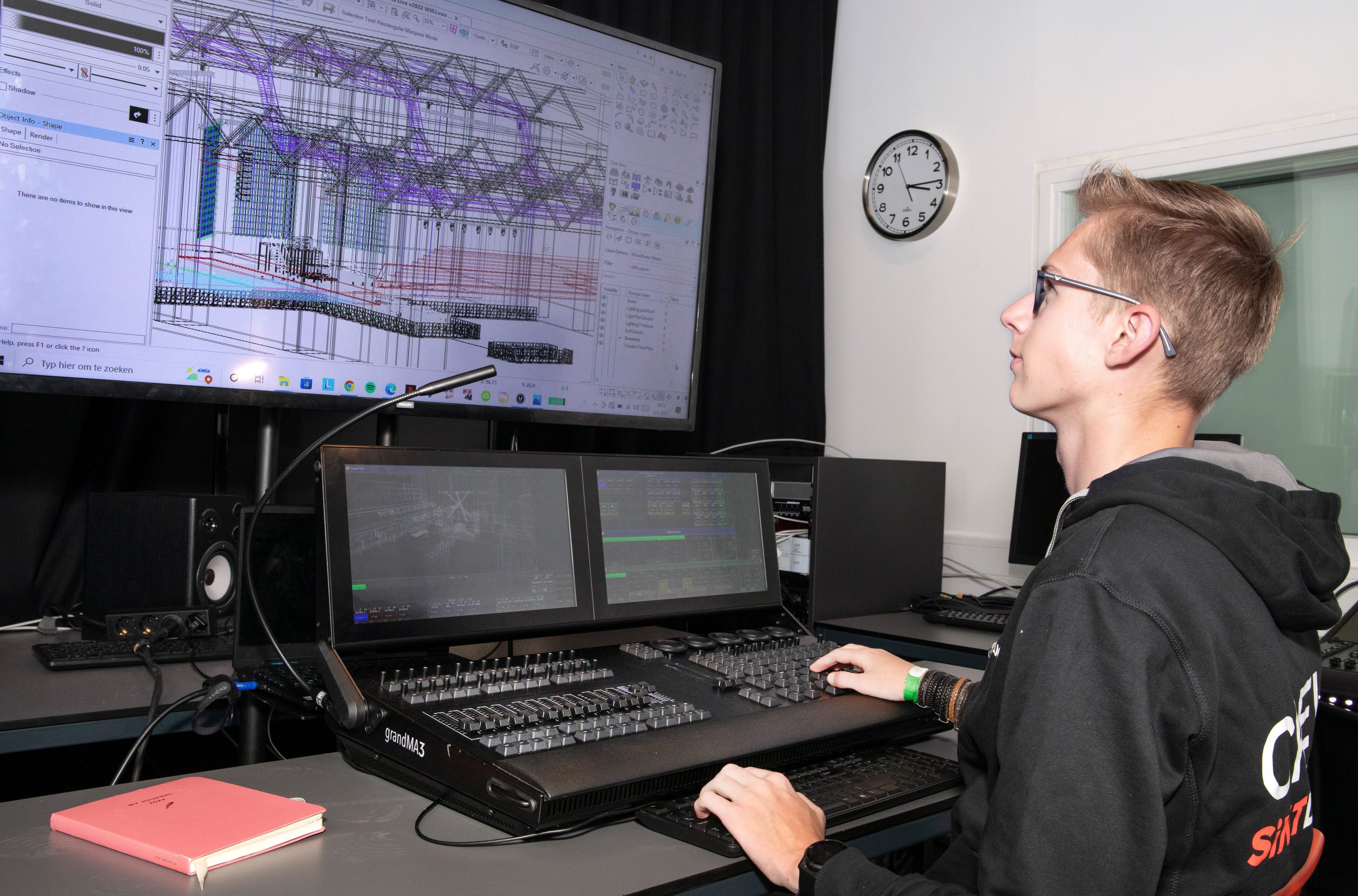 Je ontwikkelt vaardigheden op het gebied van licht-, geluid-, en beeldtechniek, rigging, electriciteitsleer en projection mapping technieken. Je leert onderzoeken, experimenteren en visualiseren, het stapsgewijs voorbereiden van een technische productie en werken met software, zoals Capture, Vectorworks, WYSIWYG, GrandMA 3D, DAW software (Studio One, Audition) en Resolume. Daarnaast kun je het BMT-certificaat halen (Bedieningsvakman Mechanische Trekkenwand). Uiteraard horen ook algemene vakken als Nederlands, Engels en rekenen tot het programma. Je krijgt in de opleiding veel ruimte om praktijkervaring op te doen tijdens events van SintLucas en van externe opdrachtgevers. Daarnaast kun je met eigen projecten aan de slag, bijvoorbeeld events bij jou in de buurt of een productie met de band waarin je speelt. Ook werk je samen met studenten van andere opleidingen binnen en buiten SintLucas, zoals het Rock City Instituut en de Metal Factory. Je bouwt met deze persoonlijke leerroute een heel eigen portfolio op.