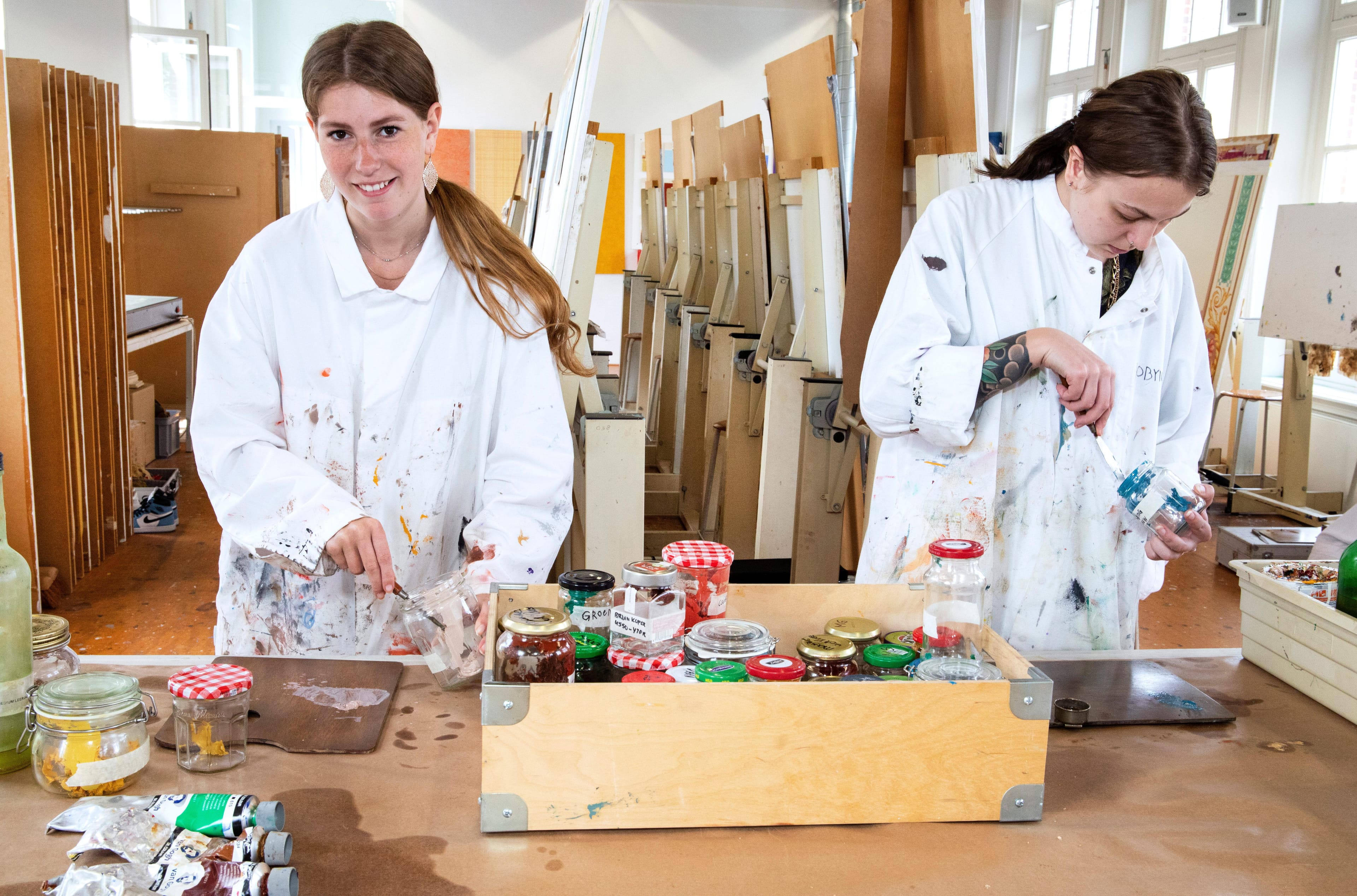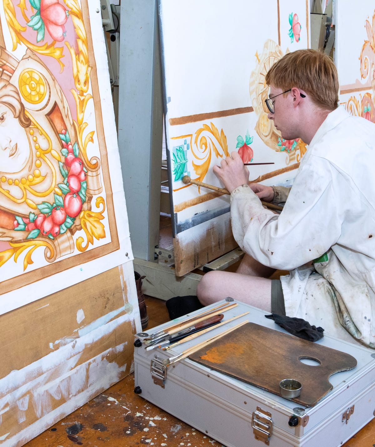 In de ateliers werk je aan opdrachten, waarbij je processen leert die aansluiten bij de praktijk. Bij levensechte opdrachten restaureer je bijvoorbeeld de wanddecoratie in een historisch gebouw of breng je een nieuwe schildering aan op een muur in een openbare ruimte.