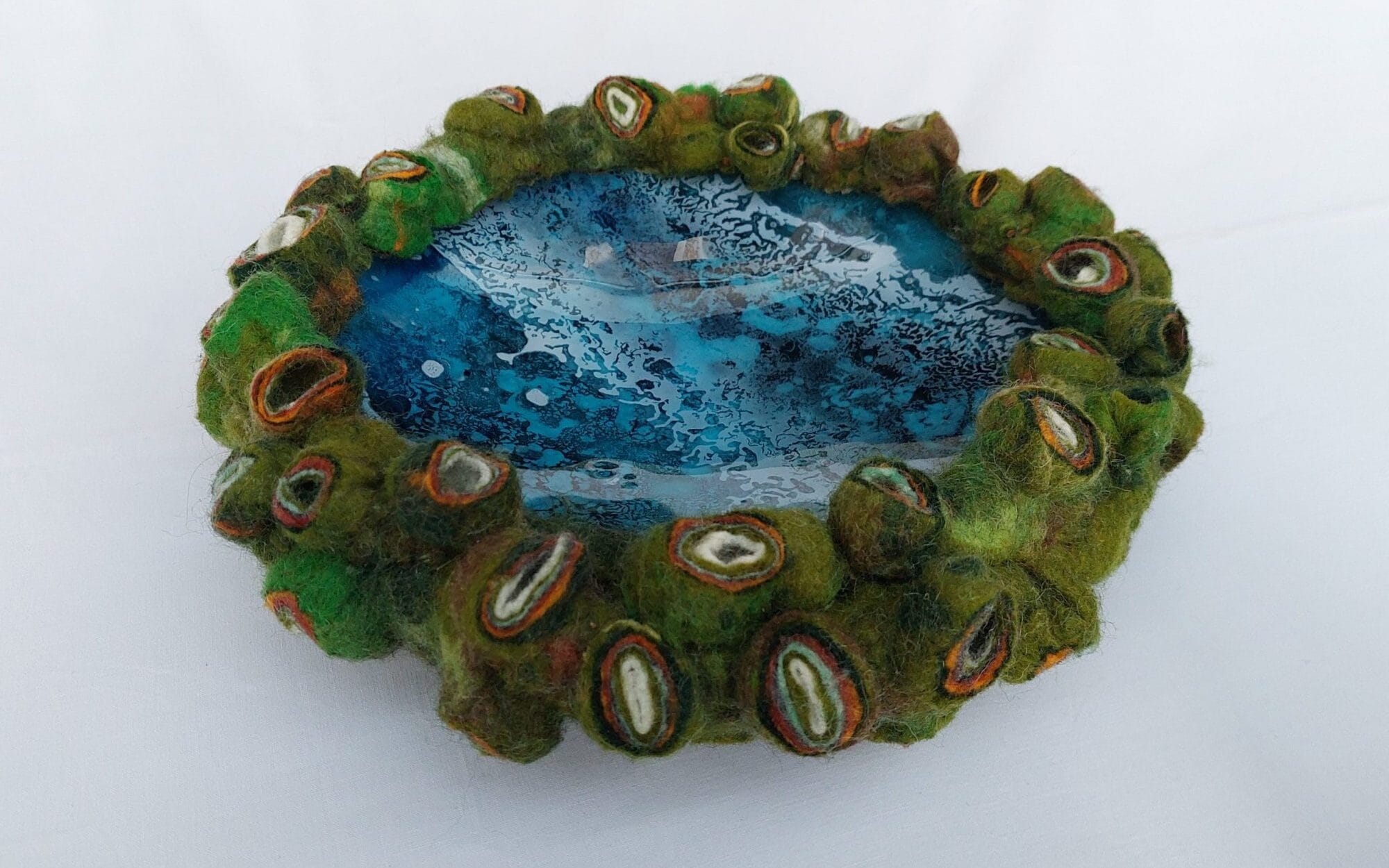 Student Creatief vakman glas Noa Schoondermark ontwierp de decoratieve schaal voor Leisurelands. Noa: “Voor mijn schaal heb ik glas gecombineerd met textiel. Ik heb een aantal jaar geleden een viltcursus gedaan en de technieken die ik daar geleerd heb zijn mij altijd bijgebleven. Het leek mij voor deze opdracht mooi om deze techniek weer te gebruiken om contrast tussen het harde, glanzende van glas en het zachte van vilt weer te geven.” Het glas in de schaal symboliseren de meren van Leisurelands en het vilt om de schaal heen de natuur. De schaal is zowel functioneel als decoratief te gebruiken.