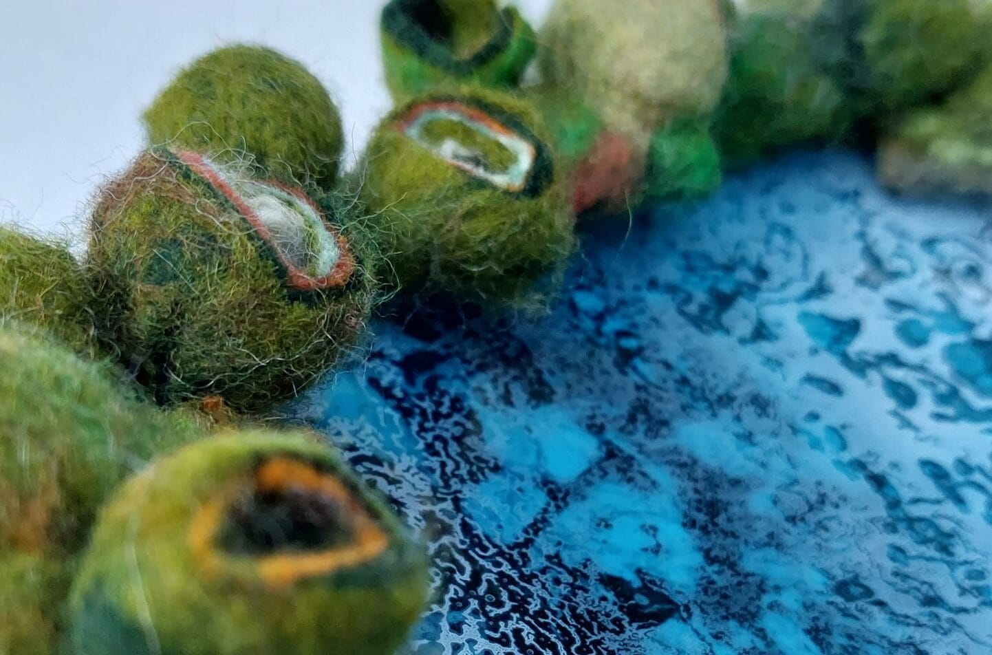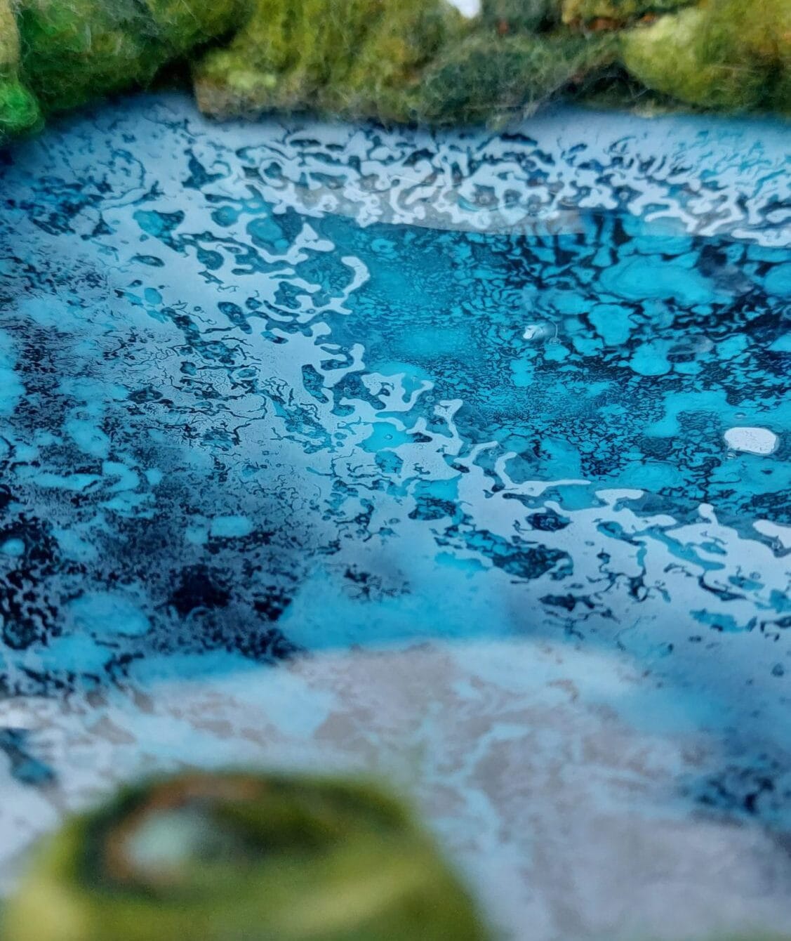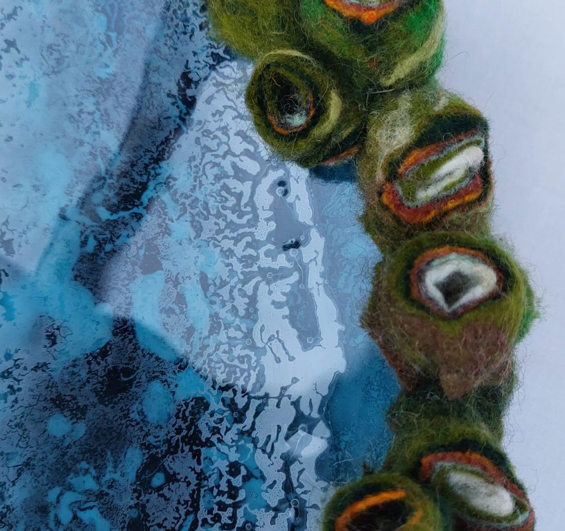 Noa: “De fuse en smelttechnieken die ik voor het glazen stuk gebruikt heb waren best nieuw voor mij. Ik ben aan de slag gegaan met het doen van verschillende testjes om het marble effect te creëren. Dit is uiteindelijk goed gelukt. Het vilt heb ik opgebouwd uit verschillende lagen. Door middel van het vilt nat te maken met warm water en door de zeepwrijving komen de vezels bij elkaar en krijg je het gewenste effect.”